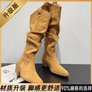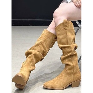 2025年复古尖头皱褶显瘦堆堆靴粗跟高跟长筒时髦长筒时装靴女黑色