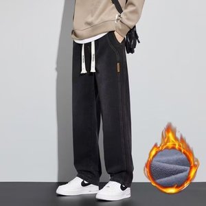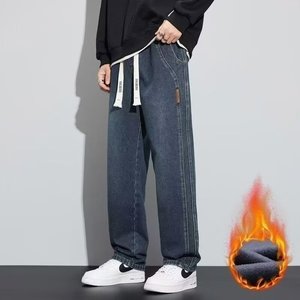 秋冬加绒青少年牛仔裤男阔腿直筒牛仔裤复古新款美式宽松男士裤子