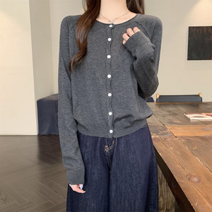 实拍 2025秋季韩版宽松简约休闲插肩圆领6羊毛针织开衫外套女毛衣