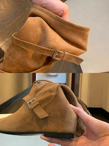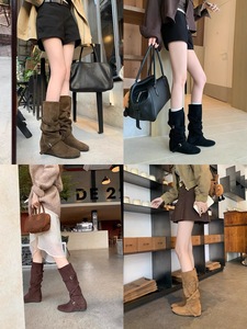 牛皮版~复古绒面交叉带平底褶皱堆堆靴女大筒围显瘦内增高中筒靴