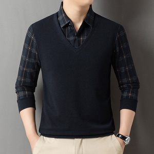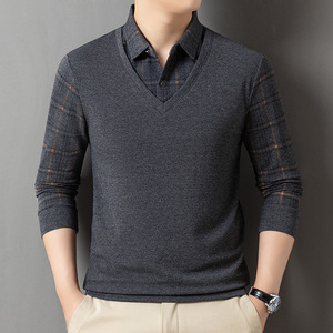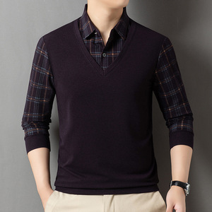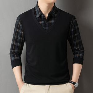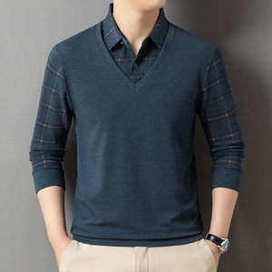 2025长袖翻领T恤内搭中年男士春秋假两件上衣爸爸宽松休闲打底衫