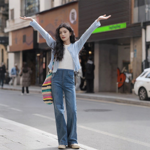 孕妇抽绳牛仔裤秋季孕妇喇叭裤外穿弹力牛仔休闲裤复古蓝长裤