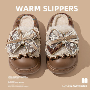 棉拖鞋女秋冬季2025新款韩版百搭可爱蕾丝蝴蝶结学生加绒毛绒棉拖