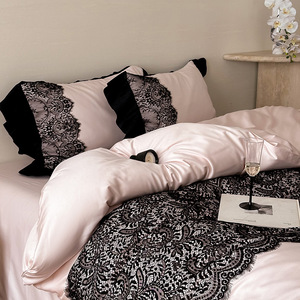 维多利亚高端轻奢法式四件套蕾丝100支长绒棉贡缎床上用品粉色单2