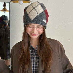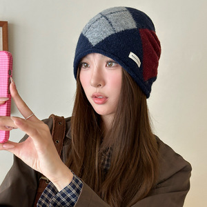 日系复古菱格拼接堆堆帽秋冬撞色街头百搭时髦冷帽网红显脸小冷帽
