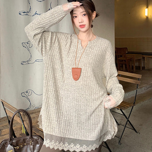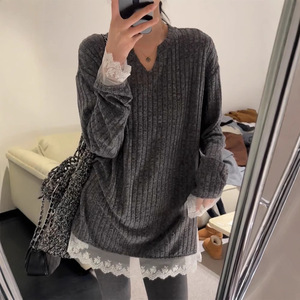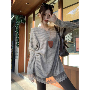 拼接蕾丝花边磨毛针织衫女2025春秋新款时尚慵懒风V领长袖上衣ins