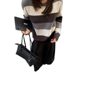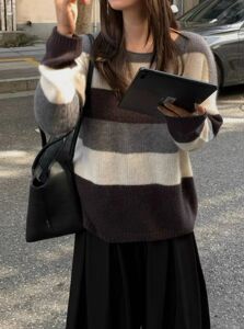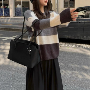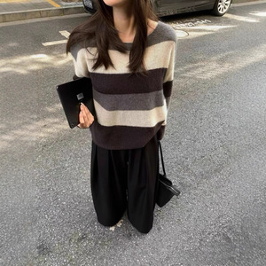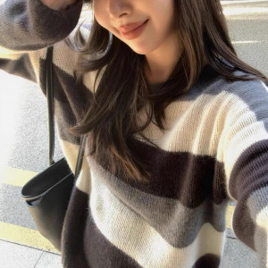 女式100纯羊毛衫圆领毛衣韩系氛围感慵懒风秋冬新款间色条纹内搭