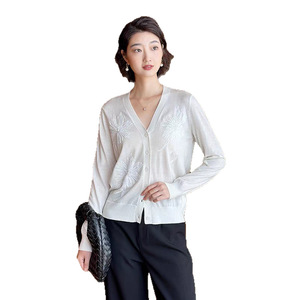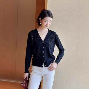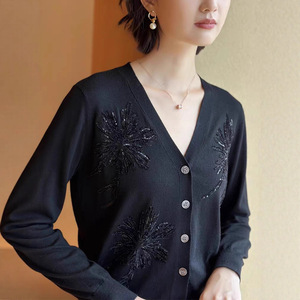 秋冬新款羊毛珠花V领针织开衫薄款气质休闲百搭上衣女