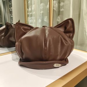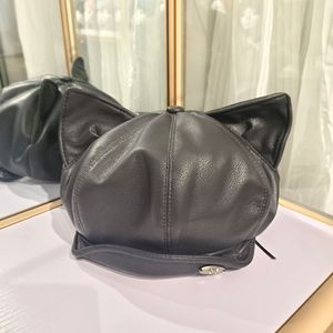 新款猫耳朵pu皮质贝雷帽秋冬女潮流百搭云朵帽甜酷显脸小画家帽子