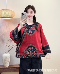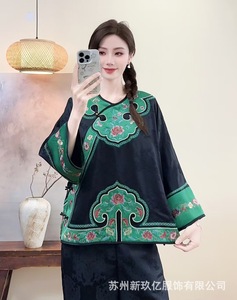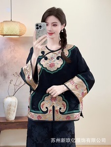 2025新款民族风复古刺绣盘扣外套女新中式盘扣提花缎面宽松上衣
