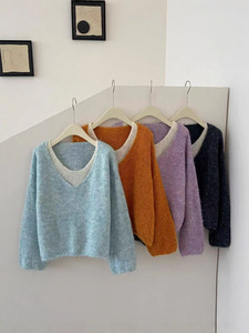 素色V领假两件针织衫女秋季叠穿新款软糯内搭套头毛衣温柔风女装