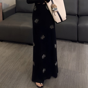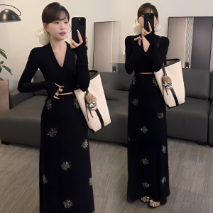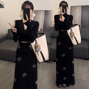 官图 春秋韩系紧身V领长袖打底上衣+高腰印花百搭半裙时尚两件套