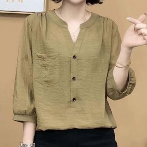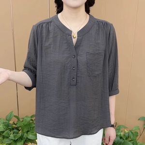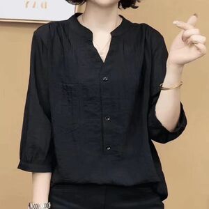 宽松夏季薄款大码时尚设计气质显妈妈纯色中袖衬衫减龄上衣衬衣