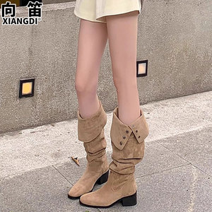 牛皮版过膝靴子女两穿长筒靴粗跟骑士靴西部牛仔靴褶皱堆堆靴皮靴