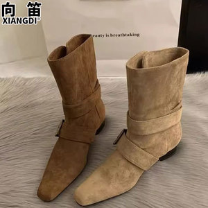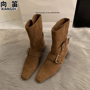 牛反绒法式小短靴女2025秋冬季新款西部牛仔靴粗跟中筒靴子骑士靴