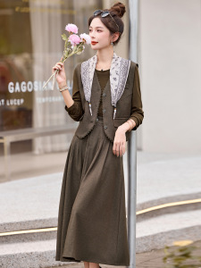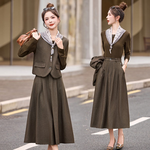 时尚休闲套装2025秋季新款女马甲+打底衫+半裙三件套配丝巾YB8607