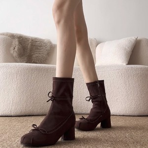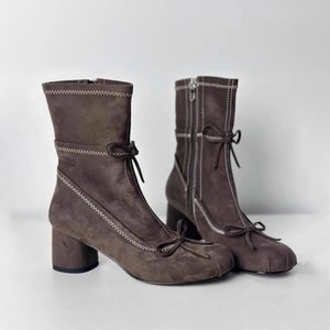 软皮版~芭蕾风蝴蝶结粗跟侧拉链短靴2025小众设计感绒面瘦瘦靴女