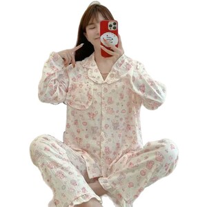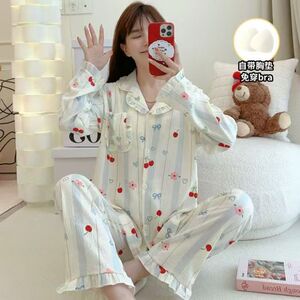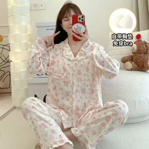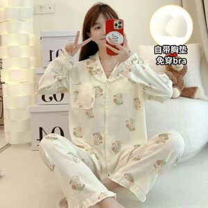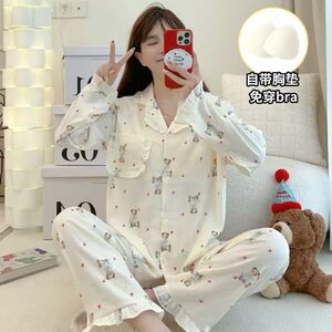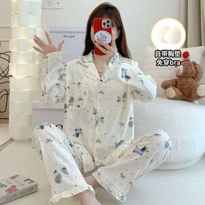 跨境外贸睡衣女春秋长袖长裤云朵棉带胸垫开衫皱边家居服套装