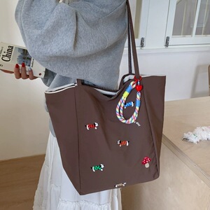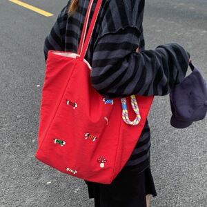 新款日系蘑菇绣花帆布包大容量文艺简约手提布袋时尚单肩包