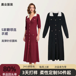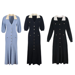 2025年欧美外贸连衣裙早秋新款撞色翻领长袖针织裙气质修身长裙