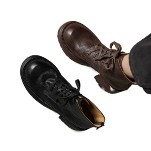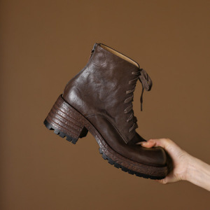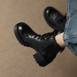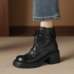 2025年新款系带后拉链短筒厚底圆头秋冬复古马丁靴粗跟机车靴女