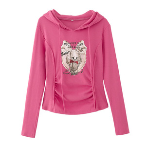 抽褶印花连帽t恤女2025早秋新款修身减龄小众长袖上衣