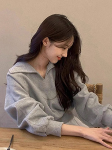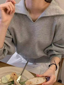 灰色polo翻领卫衣女秋冬薄款韩系设计感宽松慵懒显瘦上衣外套2025
