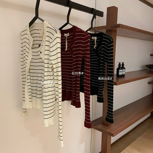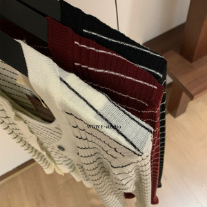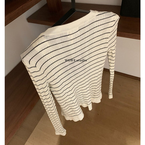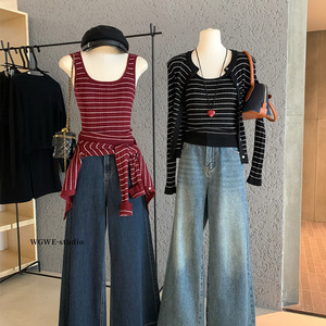 WGWE7136韩版百搭显瘦设计感小众休闲慵懒风针织衫条纹两件套