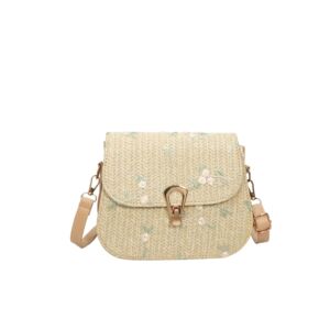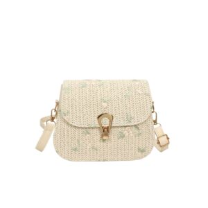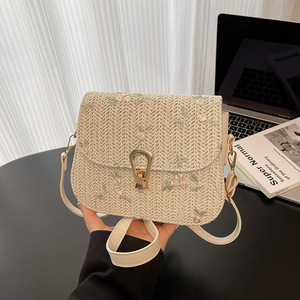 潮时尚韩版锁扣单肩斜挎包2025秋季新款ins小方包花朵刺绣草编包