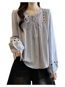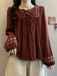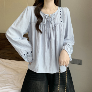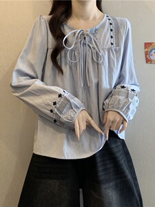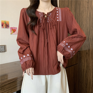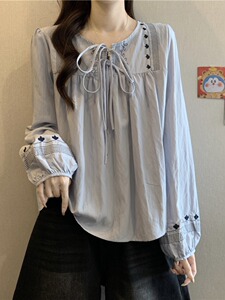 法式感刺绣长袖衬衫女秋季大码胖mm遮肚超好看漂亮娃娃衫上衣
