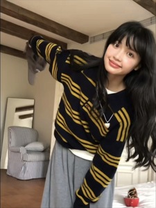 韩系2025秋冬新款polo领百搭复古条纹羊毛针织毛衣女