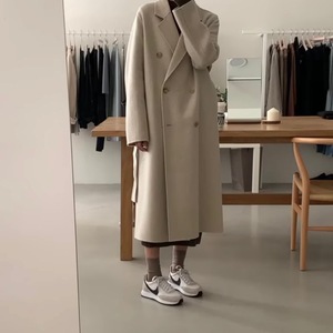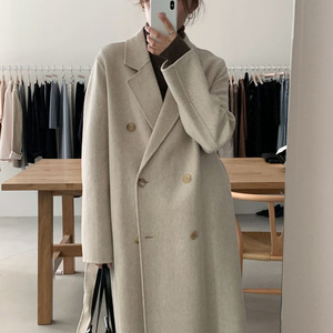 现货 韩国chic复古气质简约经典大方双排扣长款呢子大衣毛呢外套