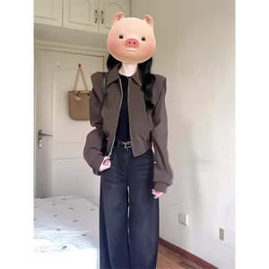 深棕色短款垫肩翻领夹克外套女春秋港风复古美拉德穿搭慵懒棒球服