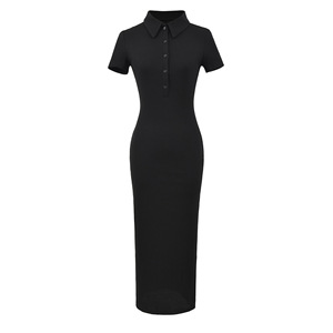 2025秋翻领单排扣包臀侧开叉长裙女辣妹弹力修身铅笔裙短袖连衣裙
