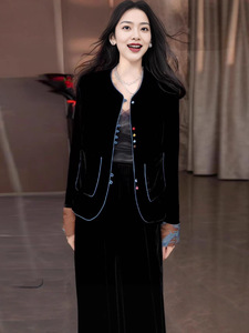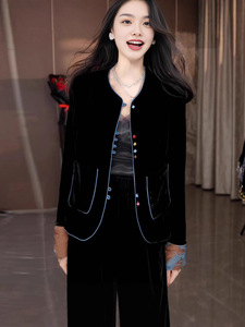 真丝丝绒拼双面双穿立领盘扣宽松百搭秋季唐装长袖复古提花外套
