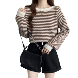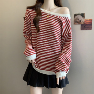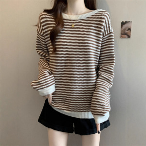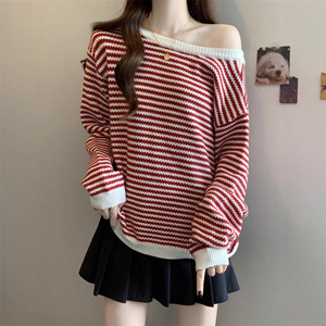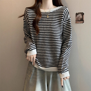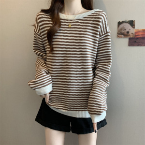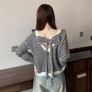 大码女装韩版露背蝴蝶结条纹长袖打底针织衫秋季胖mm显瘦百搭上衣
