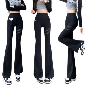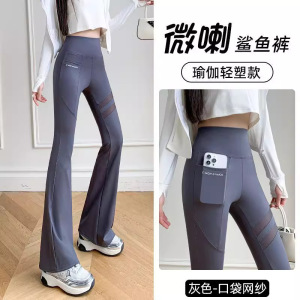 微喇瑜伽裤带口袋网纱高腰收腹提臀修身显瘦鲨鱼喇叭裤女士春秋季