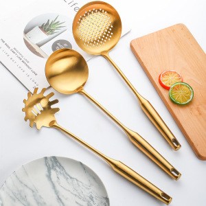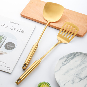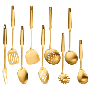 亚马逊304金色厨具9件套汤勺漏勺炒铲煎铲肉叉厨房餐厅防烫烹饪勺