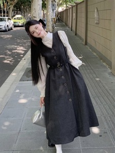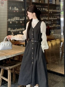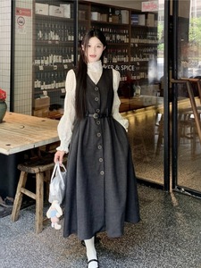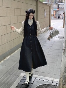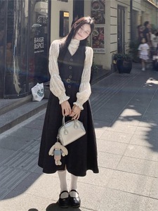 复古气质V领背心连衣裙女秋季感收腰西装中长裙波点衬衫套装
