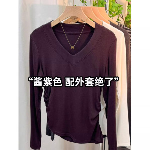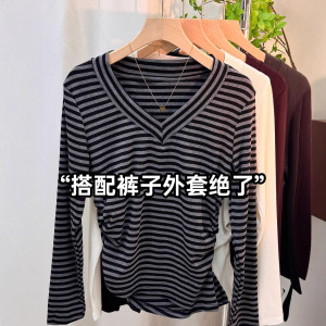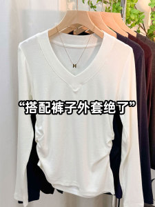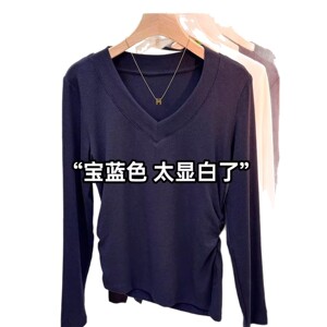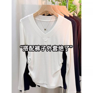 秋季新款V领开叉不规则T恤上衣女设计感小众修身百搭打底衫体恤潮