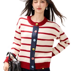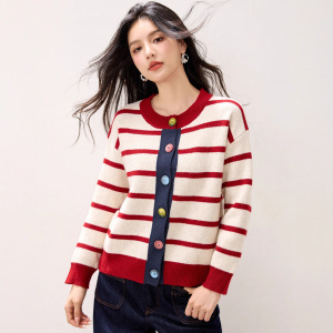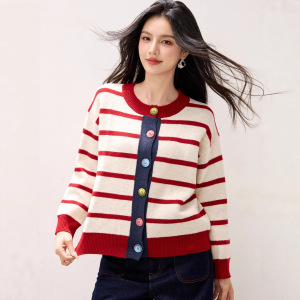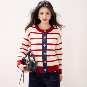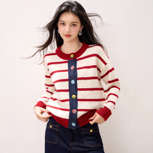 2025年秋冬新款条纹拼色针织开衫女小香风圆领单排扣宽松毛衣外套