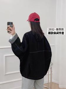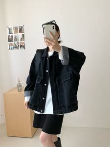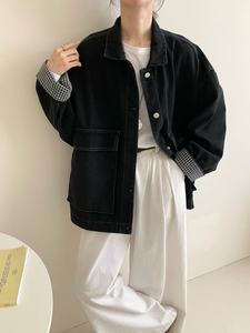2025年秋款牛仔外套大版宽松休闲韩版学院风袖口格子拼接大版外套