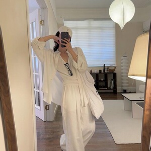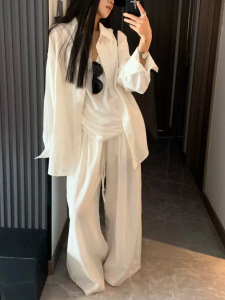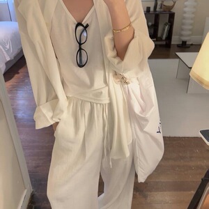 老钱风白色亚麻衬衫套装女慵懒松弛感宽松开衫背心长裤三件套