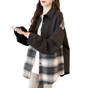宽松胖mm显瘦提花慵懒风拼接格子衬衫宽松设计感卫衣外套小众休闲