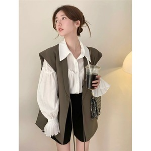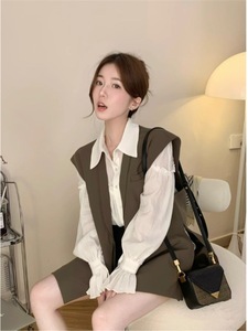复古气质时尚套装女秋季2025新款叠穿马甲外套打底白色衬衫两件套