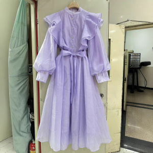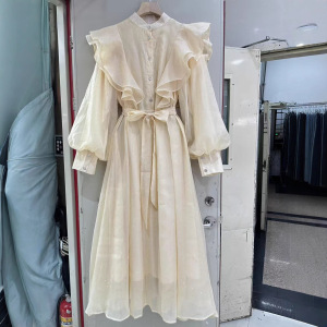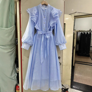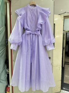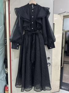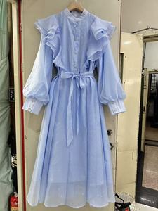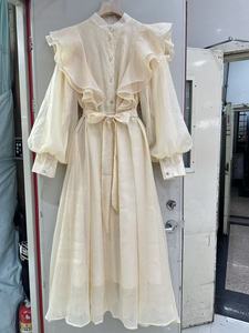 跨境外贸现货法式秋季立体花朵荷叶边高级感立领长袖中长连衣裙女