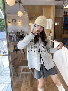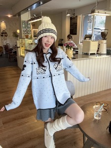 粉色费尔岛毛衣开衫女秋季新款温柔甜美减龄小狗提花针织外套上衣