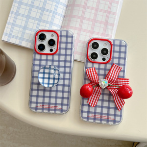 蓝色格纹英文壳+立体丝带蝴蝶结樱桃