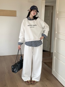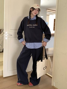 2025新款套装女装秋宽松美式卫衣翻领假两件直筒休闲裤显瘦两件套