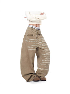 欧美跨境美式辣妹嘻哈阔腿裤字母印花牛仔裤女梨形身材宽松长裤潮